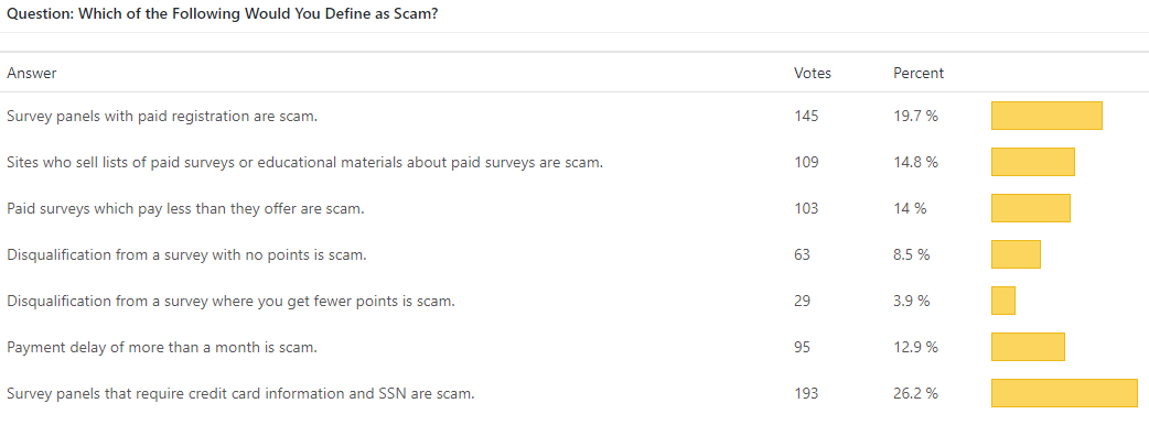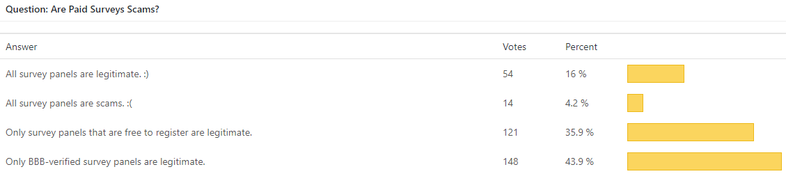 Paid surveys are not scams! Based on several questions, we can finally say that. Only 14 people from about 1,000 said that paid surveys are scam. We have also found that a very low percentage of people said all surveys are legitimate – only 54 people from 1,000 said that. Instead, people prefer to verify the panel legitimacy before registering. People prefer to read about the panel in BBB, comments, blog posts, forums, etc. before registering. Many people said that sites with paid registration are scam, many people said that sites requesting SSN and credit card information are scam. Only true things! But … this is totally different from saying that paid surveys are a complete scam!