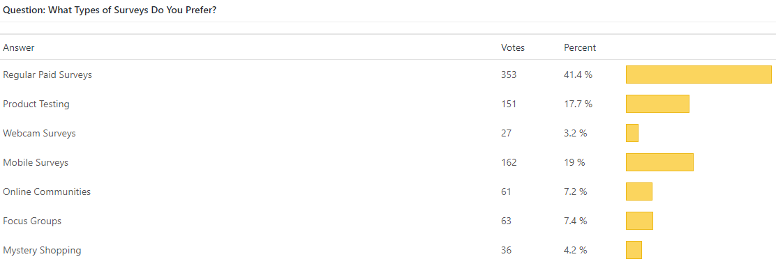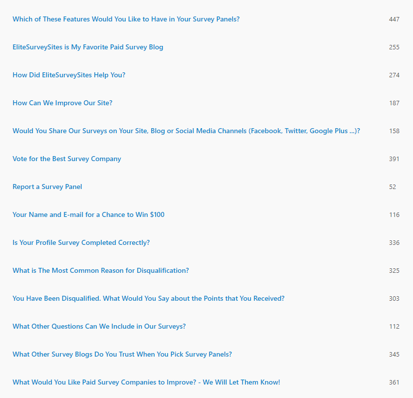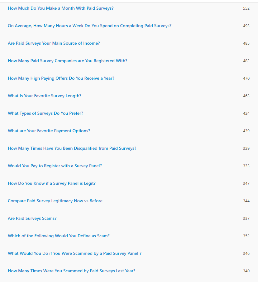 EliteSurveySites is one of the most popular paid surveys blogs and there are thousands of people registered with us. We asked them to complete our questions. Each of the questions received from 300 to over 500 answers. Overall. about 1,000 people agreed to answer at least one question. Not all of these people answered all of the questions, and that is why you see this difference. So, before the beginning, we can say: