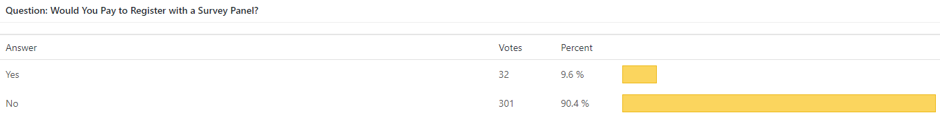 Less than 10% of the people would pay to register with a panel. This proves that people understand that there is no need to pay to register with survey panels. In addition, most people go over obvious scams like: “buy our system and you will start making $100/hour with paid surveys”. Let’s say it again: No need to pay for surveys!